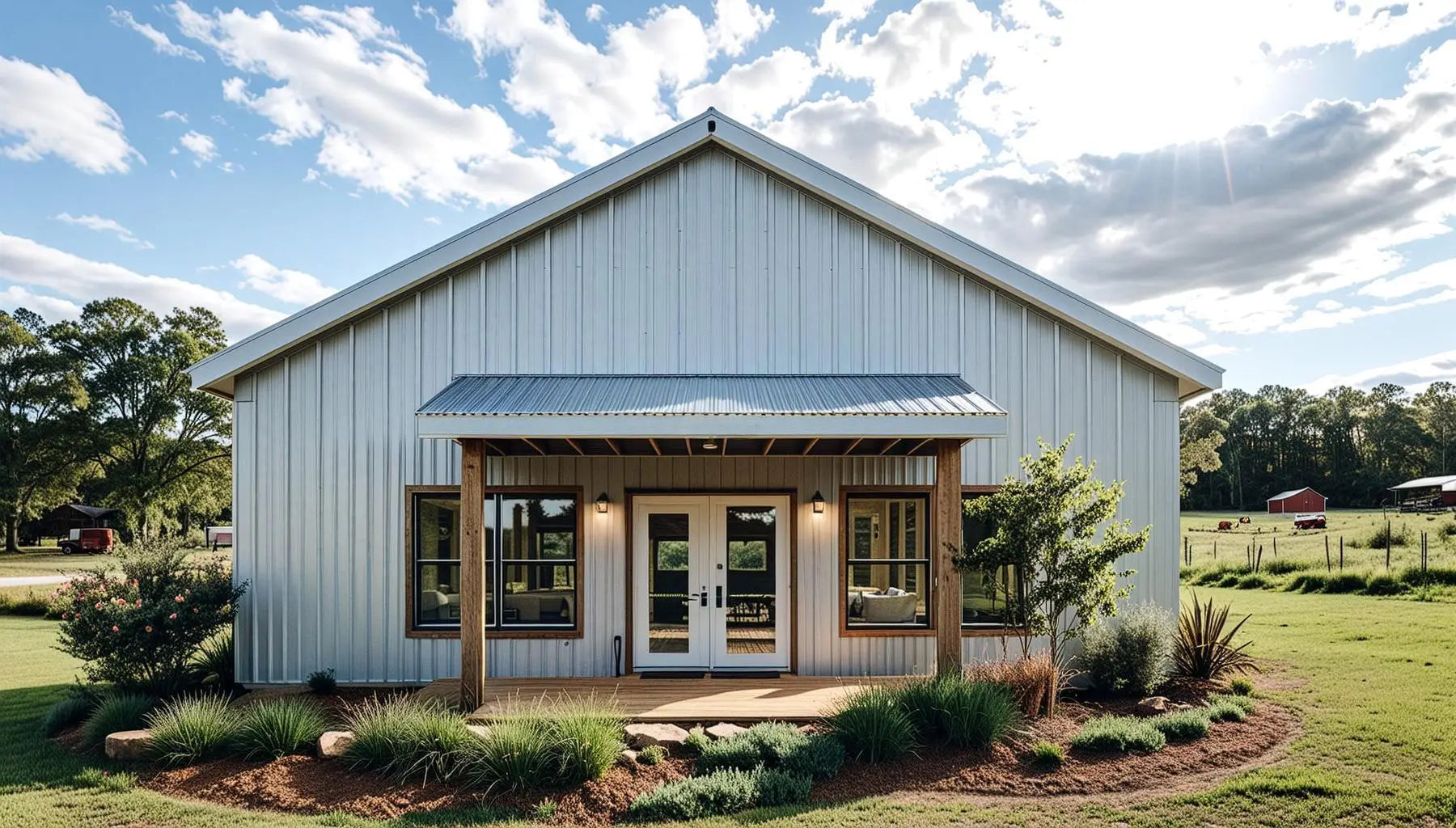 A generous front porch and a convenient side entry door add to the appeal of this delightful Barndominium design.