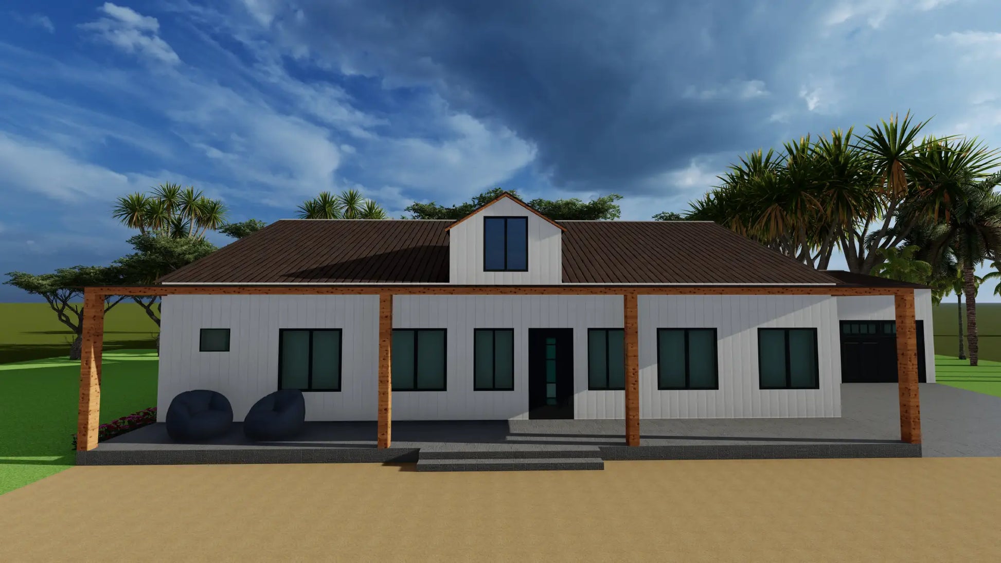 With a 2-car garage, The Dengate Plan blends practicality, comfort, and contemporary barndominium style.