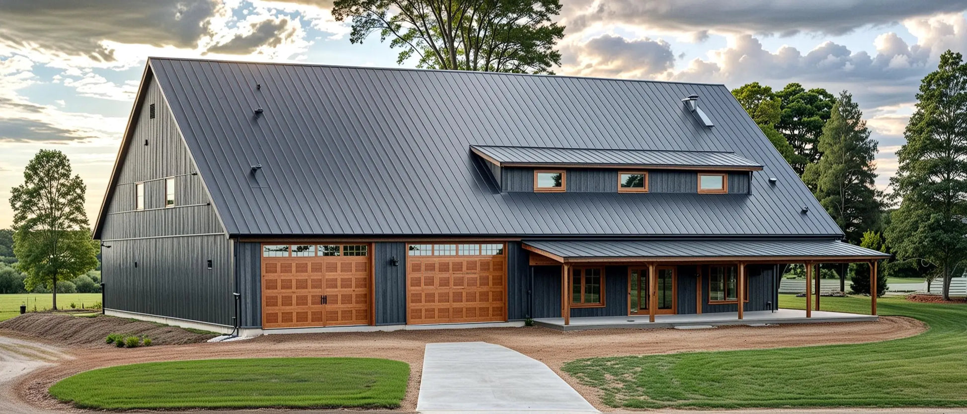 This barndominium features five bedrooms and three bathrooms, along with a dedicated office space for work or study.