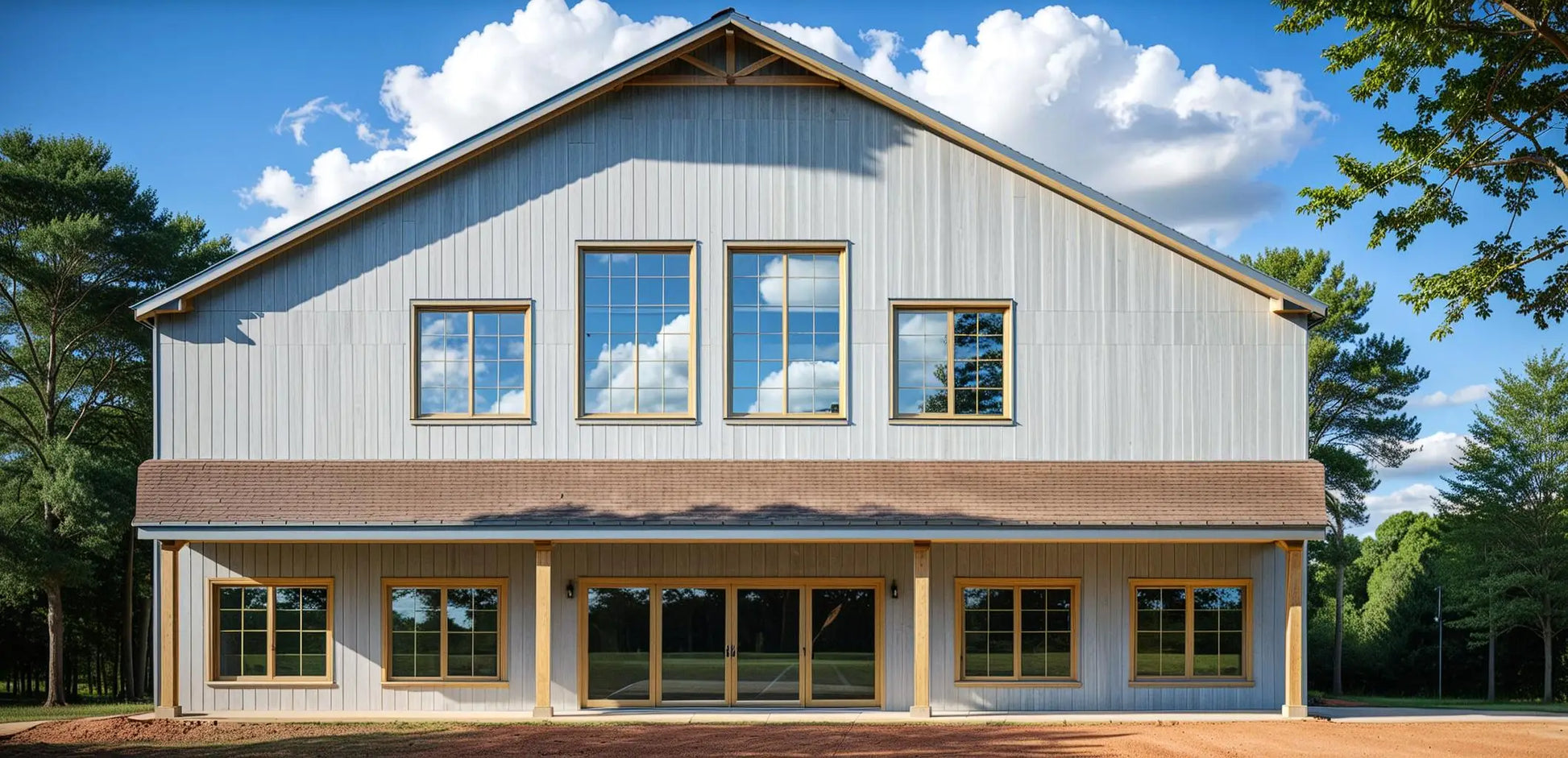 Spanning two stories, this barndominium features five bedrooms and four bathrooms, providing ample space for family and guests.