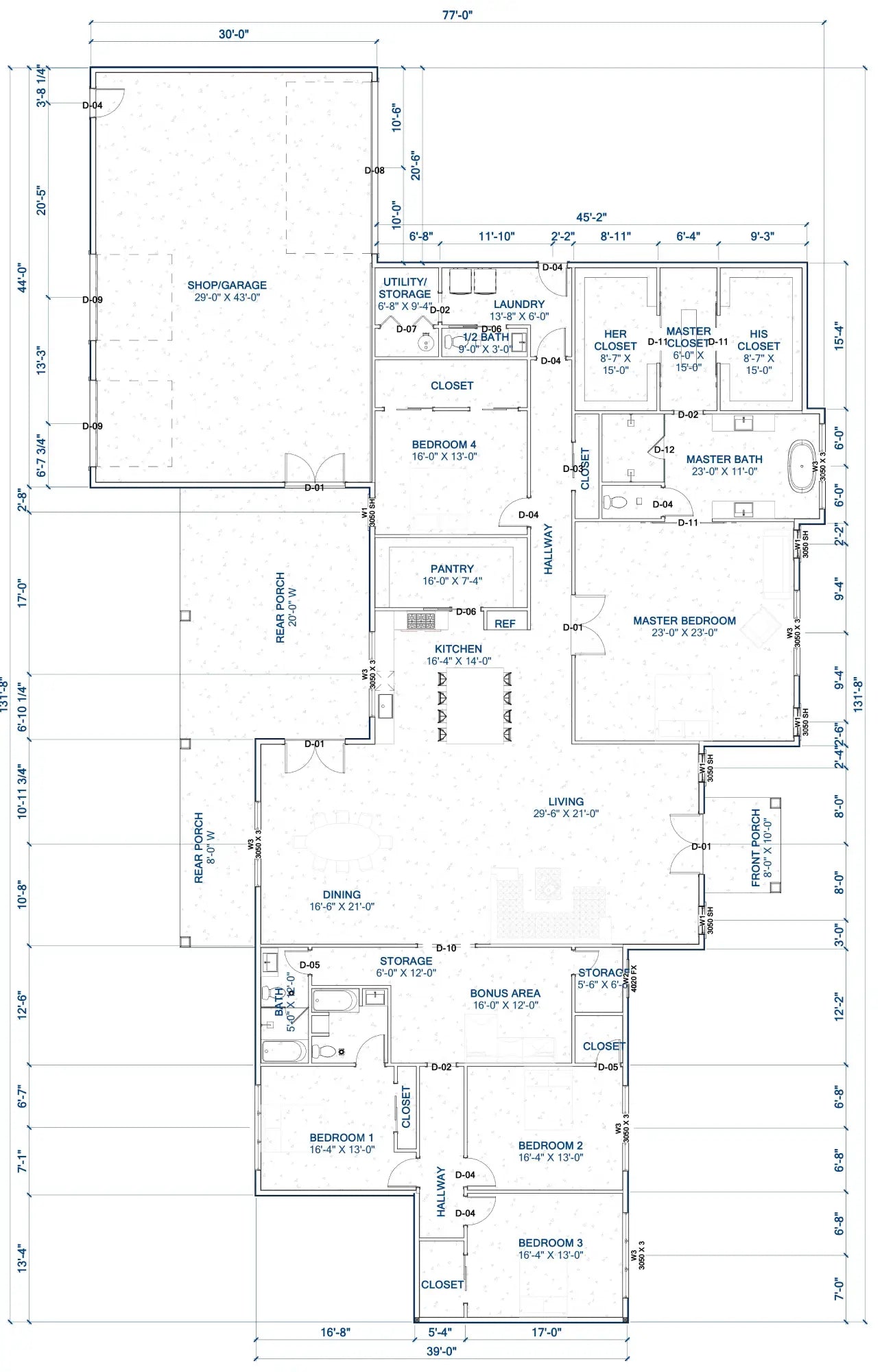 The Redcombe Plan offers 6,730 sq. ft. of expansive living space within a 77' x 131' 8" layout, thoughtfully designed for both comfort and functionality.